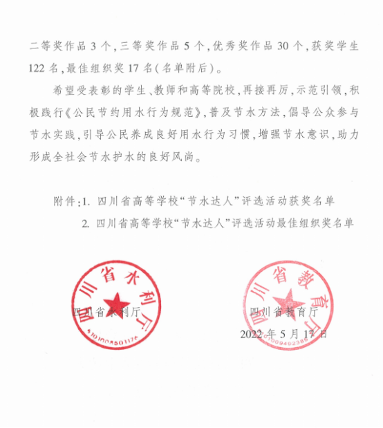 日前,四川省水利厅、教育厅2021年10月联合举办的四川省高等学校“节水达人”评选活动出炉,评出获奖作品一等奖1件、二等奖3件、三等奖5件、优秀奖30件,获奖学生122人,最佳组织奖学校17所。我院获最佳组织奖。