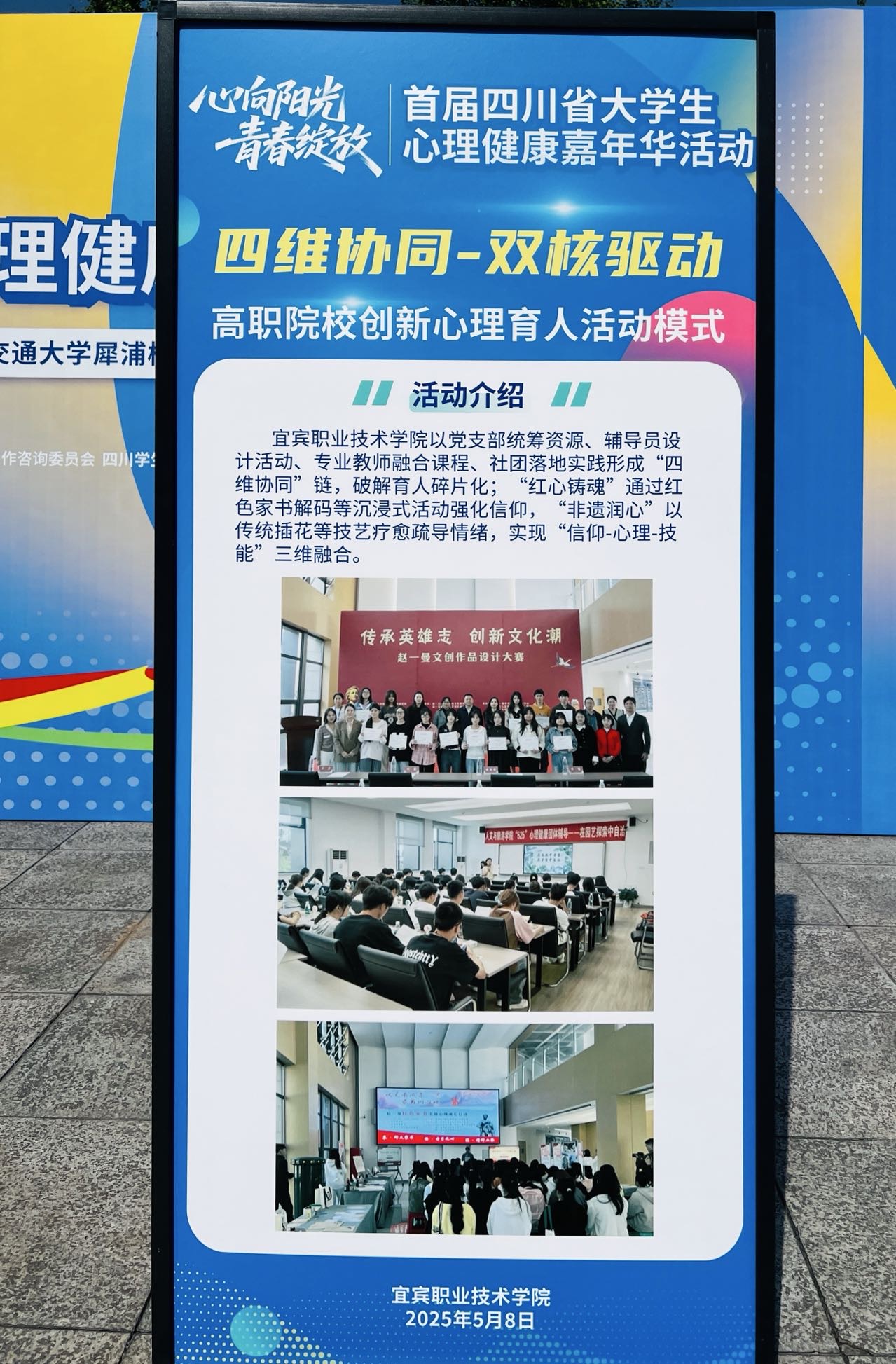 近日,由四川省教育厅、共青团四川省委联合主办的首届四川省大学生心理健康嘉年华暨全省学生心理健康宣传教育月活动在西南交通大学隆重启动,全省95所高校师生代表齐聚一堂,我校皇冠“绘心”辅导员工作室《四维协同·双核驱动 高职院校创新心理活动育人模式》、五粮液技术与食品工程学院《以“四度四心”为曲,酿造大学生心理健康“琼浆”》两个心理育人典型案例亮相活动现场。