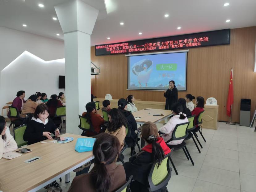 培训现场,参训居民通过情景模拟掌握了呼吸调节、正念冥想等压力管理方法,在“情绪能量瓶”心理韧性游戏中构建起积极认知模式。