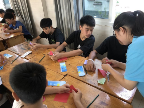 剪纸课时,队员杨丰连和徐静讲解了剪纸的起源和发展、剪纸的形式和样式以及剪纸的技巧,并带领学生一步一步的学习了单色剪纸中的对折剪、对角剪、三角剪、四角剪,经过教学,学生已初步掌握剪纸的步调和技巧。