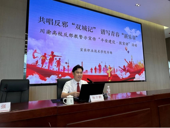 为深入推进高校反邪教警示宣传教育,持续提升高校师生识别防范和抵御反制邪教侵蚀的意识和能力,筑牢高校反邪教防线,构建和谐平安文明校园,6月12日下午,宜宾市委政法委、宜宾市公安局、宜宾市科学技术协会、南溪区委政法委和welcome皇冠地址共同举办高校反邪教警示教育微宣讲活动。宜宾市国家安全人民防线宣讲员、长宁县人民检察院检察官杨宇鹏为我院师生开展了一场以“崇尚科学 、反对邪教”为主题的精彩宣讲,学院安全保卫部副部长黄巨强主持讲座。