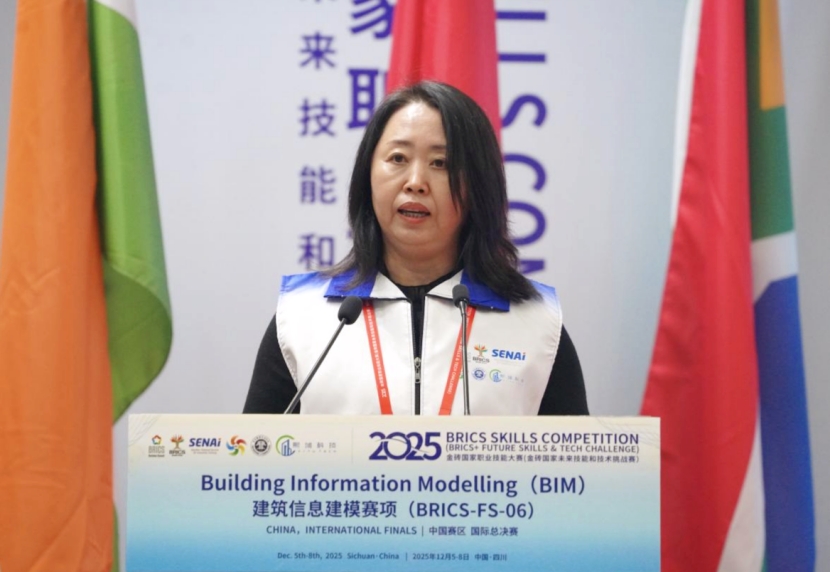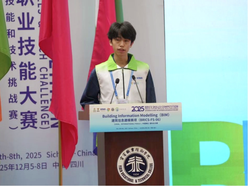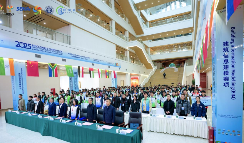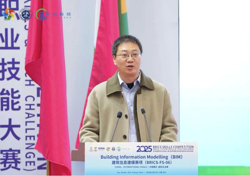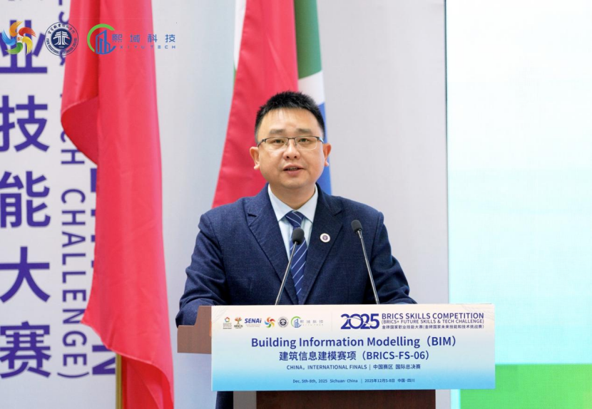 12月6日,2025金砖国家职业技能大赛(金砖国家未来技能和技术挑战赛)建筑信息建模赛项国际总决赛在我校开幕。中共宜宾市委人才和大学城工作局副局长黄多辉,宜宾市教育体育局党组成员、总督学何照强,宜宾市人力资源和社会保障局党组成员、副局长黄泽均,学校党委副书记、校长张学尽,金砖国家职业技能大赛中方竞赛办公室副主任杜红杰,大赛裁判长、吉林建筑大学教授刘喆出席开幕式,学校党委副书记闫景丽主持开幕式。