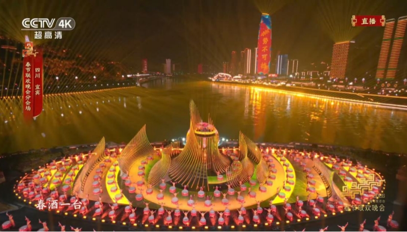 在春晚宜宾分会场《立上游》7分49秒的表演中,宜宾以“万里长江第一城”的浩荡江景为天然幕布,将民俗活动“请春酒”的喜庆氛围贯穿全场。舞台背景以“翠竹”拔地而起节节高升、生生不息为意象,同时汇聚风帆造型完美融入长江上游三江汇流的山川形胜和璀璨人文之景中呈现出宜宾蓬勃之力。