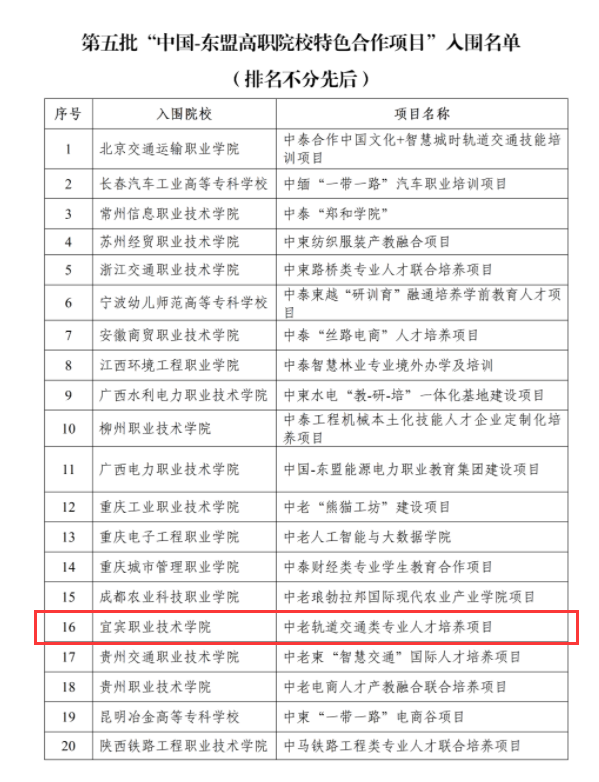 5月16日,中国教育国际交流协会公布了第五批“中国—东盟高职院校特色合作项目”入围院校名单,并给与公示,公示期为2022年5月16日起至5月23日止。我院凭借“中老轨道交通类专业人才培训项目”成功入围。