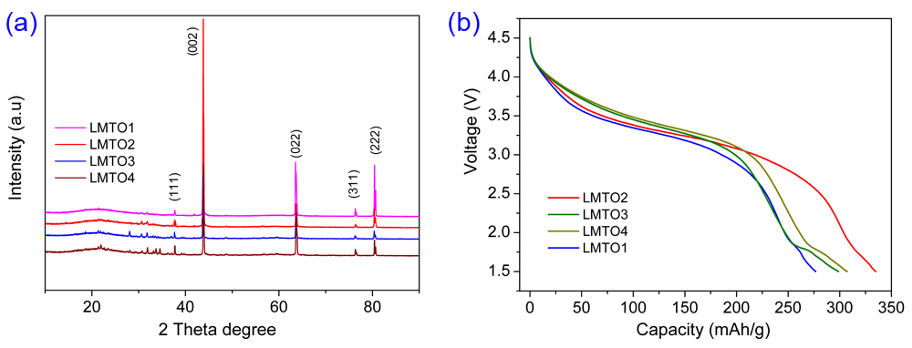 图一.备样品材料Li-Mn-Ti-O系列的XRD示意图和首次放电示意图