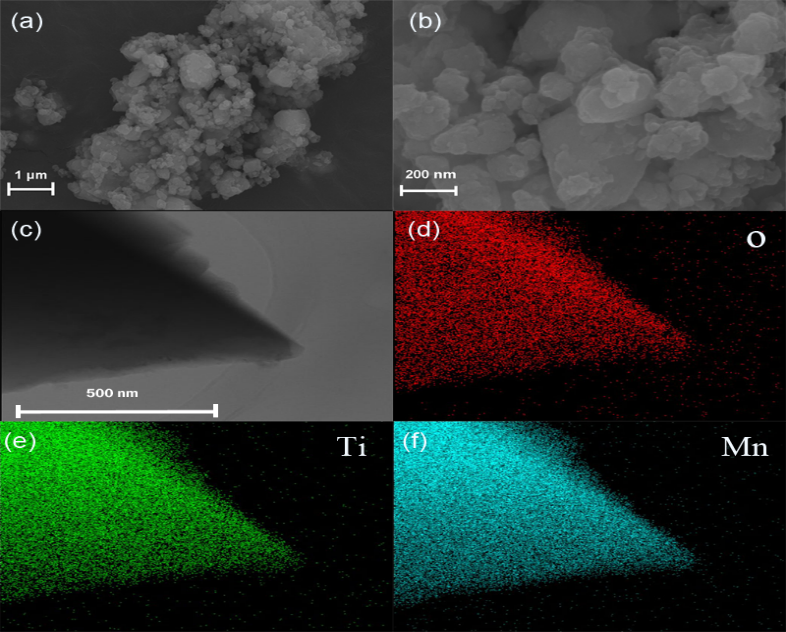 图三.所制样品材料Li1.3Mn0.4Ti0.3O2的SEM图及相应的能量色散光谱图