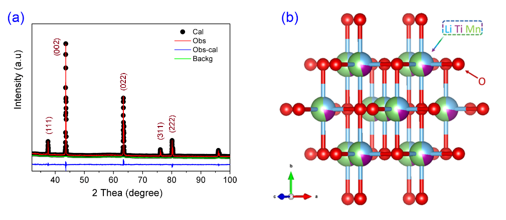 图二.所制备样品材料Li1.3Mn0.4Ti0.3O2的XRD精修图及晶体结构解析图
