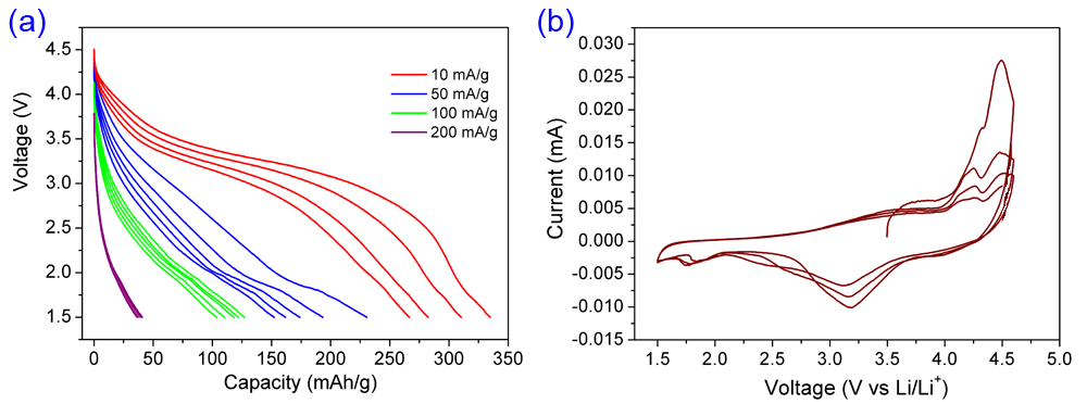 图五.所制样品材料Li1.3Mn0.4Ti0.3O2的不同电流密度下的放电曲线及循环伏安测试图