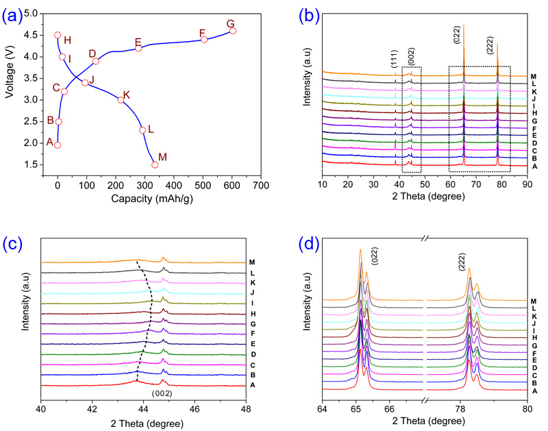 图七.首次充放电曲线上的数据采集点及对应采集点材料的XRD测试数据