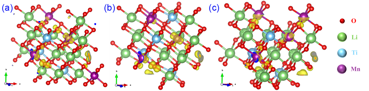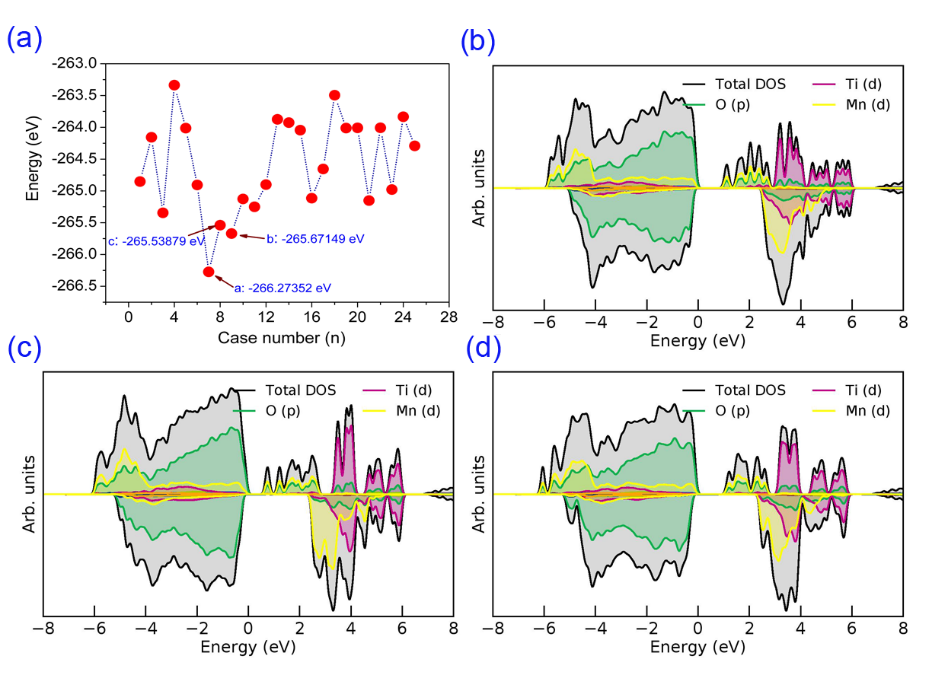 图六.具有高度对称性和均匀性的25种Li1.3Mn0.4Ti0.3O2配置的总能量分布图。(b)-(d)三种低能组态的总态密度和部分态密度(分别为情况7、8和9)。绿线、紫线和黄线分别表示O p、Ti d和Mn d轨道的态分密度图。