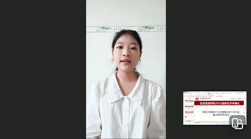 来自统计12201班的曾芷秋同学作为新生代表发言。她代表全体新生表示,要以实现中华民族伟大复兴为己任,不负时代,不负韶华,不负党和人民的殷切希望。她号召全体新生秉承“鼎承大同、钵传天工”的校训,用知识完善自我,以素质赢得发展,以高度的学习热情,扎实稳重的学习态度,乐观向上的生活心态,追求卓越,勇敢攀登。