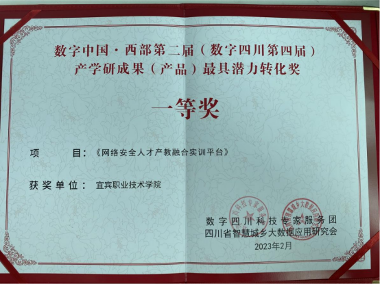 为推进网络安全产业发展,充分发挥校企合作共建优势,培养多层次网络安全人才,我院信息安全技术应用专业与企业联合申报的《网络安全人才产教融合实训平台》项目荣获“数字中国·西部第二届产学研成果最具潜力转化奖”一等奖。