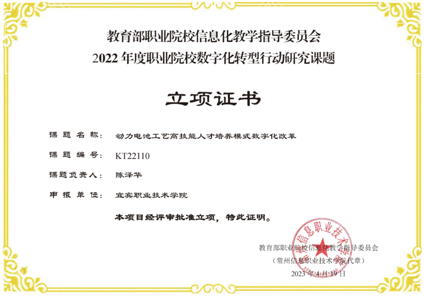 近日,根据教育部职业院校信息化教学指导委员会《关于公布2022年度职业院校数字化转型行动研究课题立项名单的公告》(信息化教指委〔2023〕1号)文件,新能源电池学院院长陈泽华副教授主持的《动力电池工艺高技能人才培养模式数字化改革》申报课题准予立项。