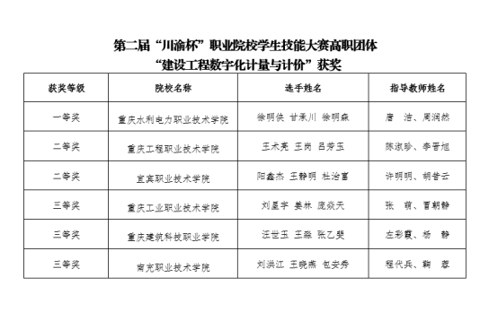 5月15日—16日,在重庆市永川区举行的第二届“川渝杯”职业院校学生技能大赛上,我院学子荣获“建设工程数字化计量与计价”赛项团体二等奖。
