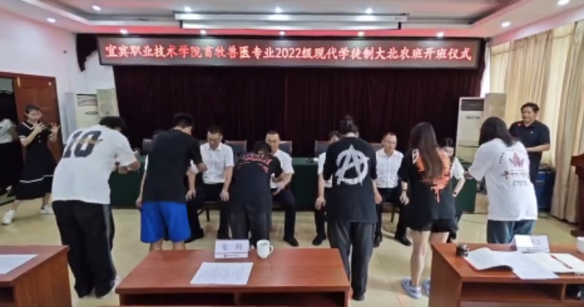 大北农集团、现代农业学院相关人员,2022级畜牧兽医专业大北农学徒制班52名学生参加仪式。(现代农业学院供稿)