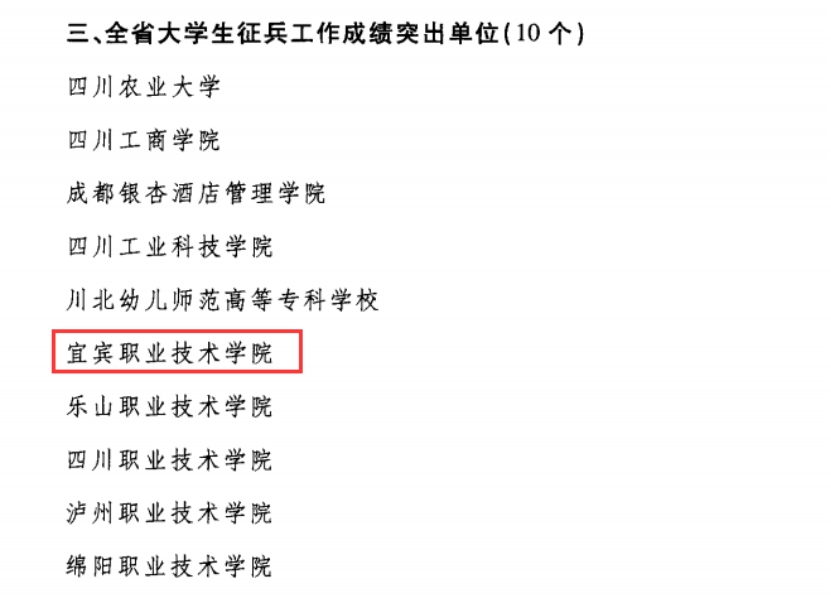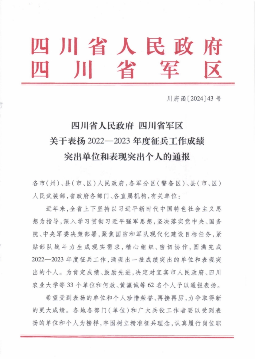 近日,四川省人民政府、四川省军区对2022—2023年度征兵工作成绩突出单位和表现突出个人进行通报表彰,我院被授予“全省大学生征兵工作成绩突出单位”荣誉称号。