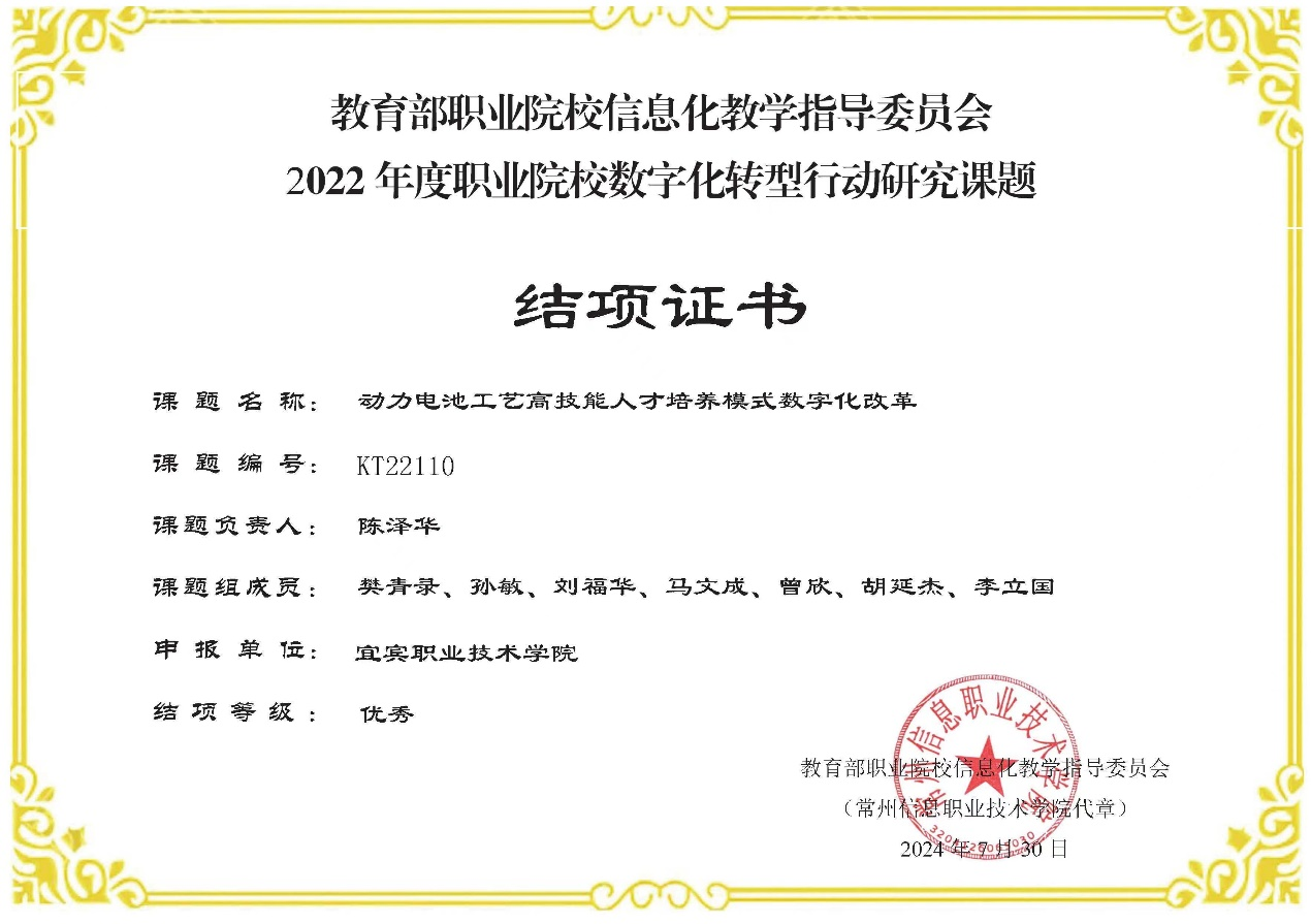 该项目于2023年4月立项,于2024年7月结项,依托陈泽华博士教学团队开展科研工作,团队成员取得国家自然科学基金项目一项、四川省级科技计划项目一项、授权发明专利五项,一人主持宜宾市技能大师工作室,成功培训宁德时代电池工艺人才订单班学员一批,指导学生参加全国职业院校技能大赛获三等奖一次,参加四川省职业技能大赛获一等奖一次、二等奖三次,参加宜宾市在宜大学生创新创业大赛获三等奖一次。此次获批全国优秀案例,是我校在搬迁新校区后的一项国家级教学成果,大大彰显了我校的教学软实力。