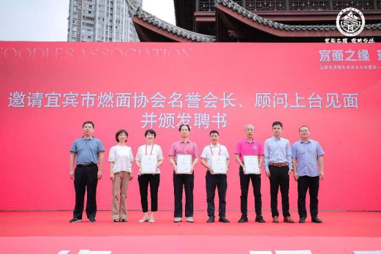 市商务局党组书记、局长朱晓莉、市委人才和大学城工作局副局长余洪吉为宜宾市燃面协会名誉会长和顾问颁发聘任证书。