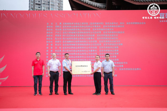 市经信局副局长朱建强、市民政局社会组织管理局局长江洪为宜宾市燃面协会颁发牌匾,燃面协会会长王赛、副会长周明玉接牌。