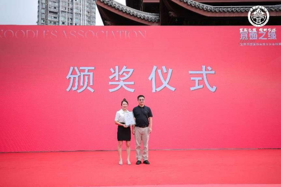 市人力资源和社会保障局四级调研员邓彬岑为宜宾市燃面协会第一届宜宾燃面技艺大赛一等奖获得者熊琼颁发奖金和证书。