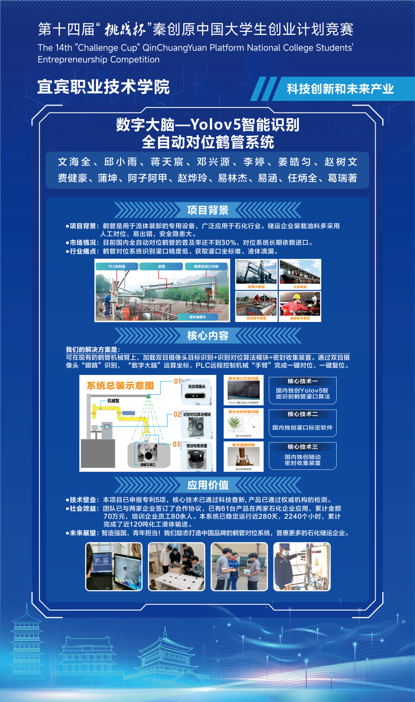 10月31日至11月2日,第十四届“挑战杯”秦创原中国大学生创业计划竞赛在西安交通大学举行。由我院智能制造学院郭容老师指导的《“数字大脑”-Yolov5智能识别全自动对位鹤管系统》项目经过校级初赛、省级复赛和全国决赛初评,最终在全国决赛终评中获得银奖,这也是我院第一次获得“挑战杯”竞赛的国家级奖项。