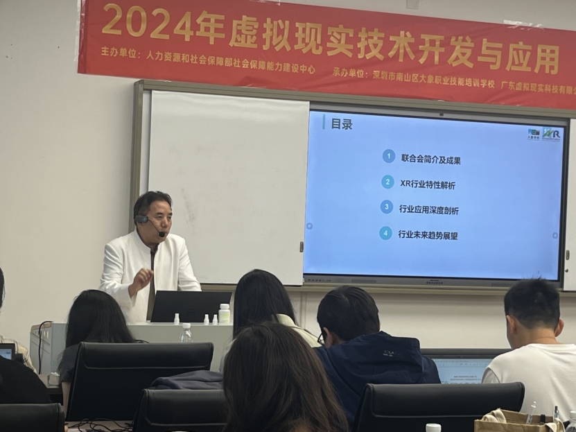 深圳市南山区大象职业技能培训学校董事长谭贻国分享了《行业应用深度剖析与未来趋势展望》,为学员们描绘并共同探索虚拟现实技术的应用前景和最新进展。