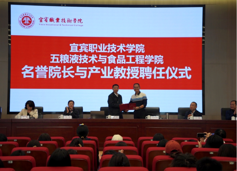 伍小兵为赵东颁发了五粮液技术与食品工程学院名誉院长聘书,陈敏为钟莉颁发了产业教授聘书。