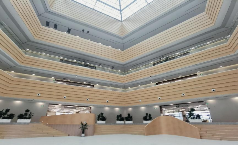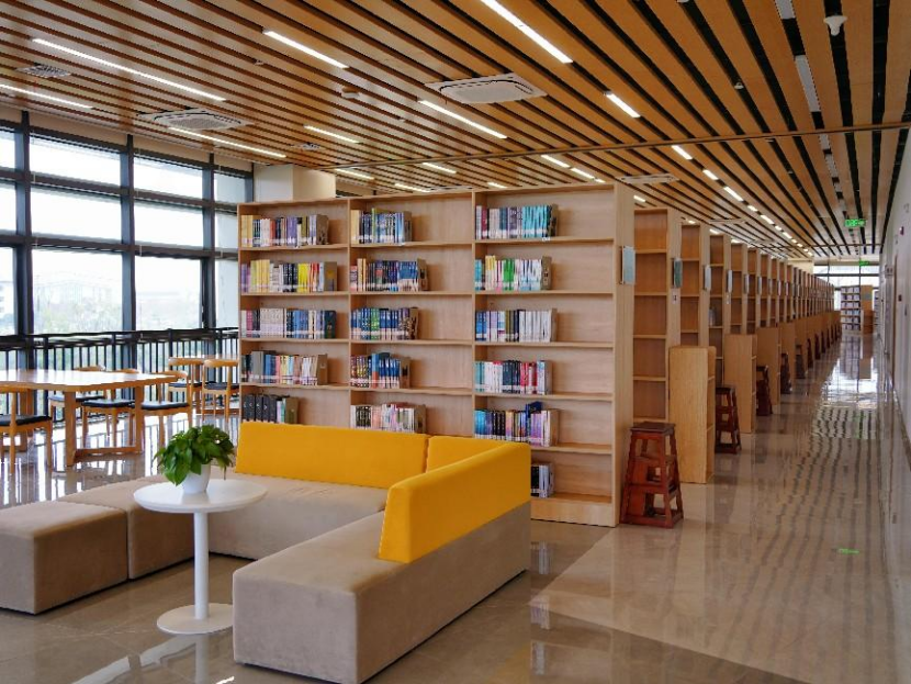 新图书馆位于共享区,占地面积3万余平方米,共有六层,在设计和布局上充分考虑了现代化办馆的需求,分别划分了社会科学、自然科学等不同图书分类区域,内设有捐赠书屋、大师工作室、玫瑰书屋、放映室、文创展览室、文创工作室、研讨室、阅读分享室、电子阅览区、沉浸式学习区、有声阅读区等11个功能区,并配有朗读亭、自助借还机、期刊阅览机等设备,为读者提供了更加舒适、便捷的阅读环境。