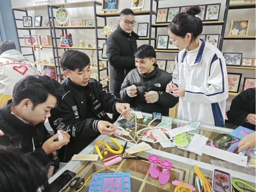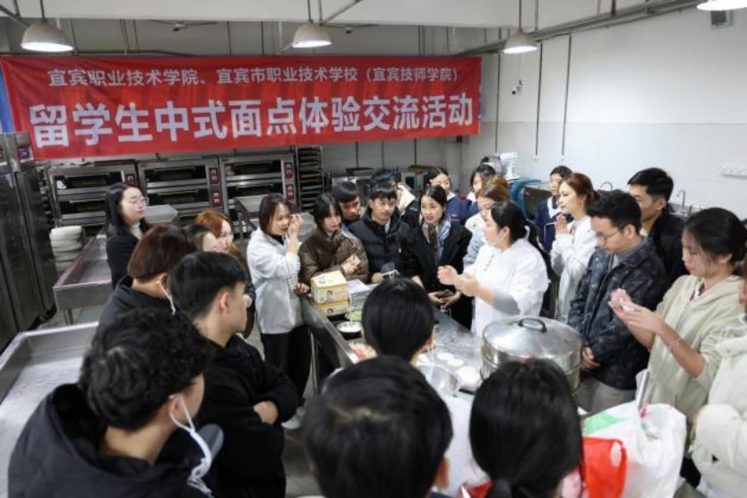随后,宜宾市职业技术学校(宜宾技师学院)为留学生们精心安排了技能特训营环节。根据留学生们的专业志向与兴趣,设置了书法、手工(衍纸艺术)、声乐、中式面点等四个方向的课程,并邀请了专业教师授课。课堂上,理论与实践交相辉映,现场示范与亲身实践紧密相连。在师生们的带领下,留学生们兴致勃勃地写毛笔字、做衍纸手工、捏包子,并欣赏了传统民乐《茉莉花》。欢声笑语中,留学生们不仅学到了技能,更感受到了中华文化的深厚底蕴。