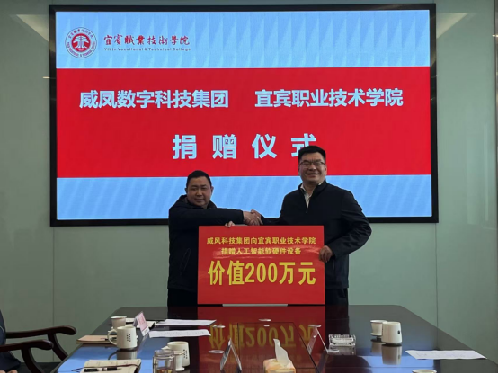最后,郭功涛、林伟代表企业和学院举行了威凤数字科技集团向学院捐赠价值200万元人工智能软硬件设备的捐赠仪式。