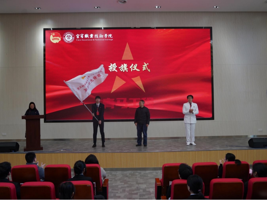 在热烈的掌声中,江仁朝向第三期先锋班授旗。