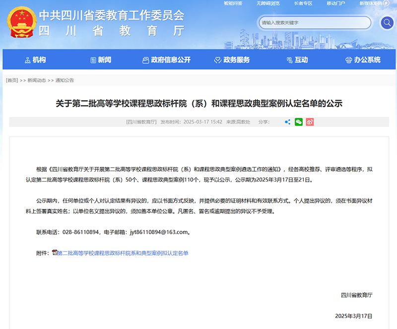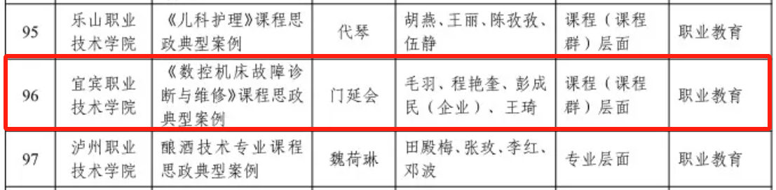 近日,四川省教育厅公示了第二批高等学校课程思政标杆院(系)和课程思政典型案例认定名单。其中,我校建筑与环境学院入选省级课程思政标杆院(系);教师门延会团队的《数控机床故障诊断与维修》课程入选省级课程思政典型案例。