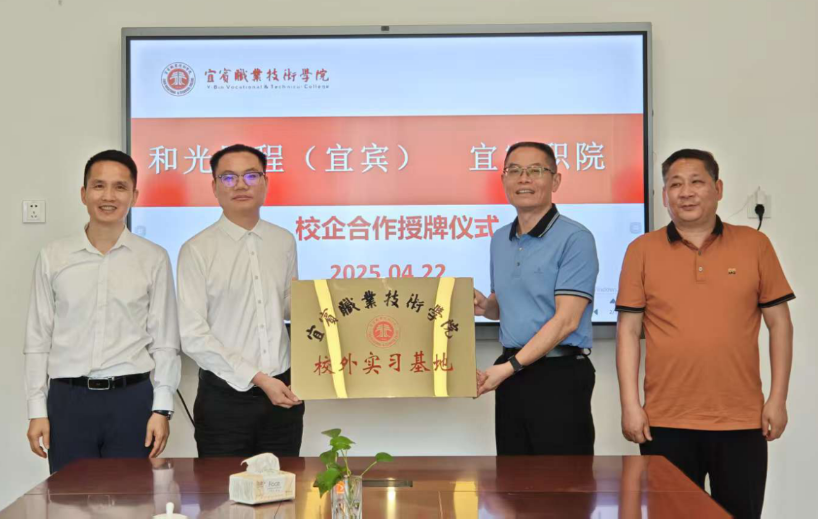会上还举行了授牌仪式。伍小兵代表学校授予和光同程光伏科技(宜宾)有限公司、宜宾昆仑新能源有限公司校外实习基地牌匾。
