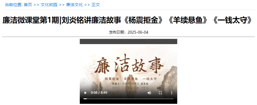 "今夜,让我们穿透时光迷雾,在杨震暮夜却金的衣袖震颤中,在羊续悬鱼飘荡的腥风里,在刘宠掷钱激起的江涛间,寻找那支永不熄灭的精神火把,因为这把火,正照着你我当下的抉择……”素质教育学院率先以沉浸式情景微课堂拉开“一月一院一课堂”的序幕。课堂上,教师化身 “历史讲述人”,通过光影交织的背景与声情并茂的演绎,将古代清官廉吏的故事搬上课堂,让师生们在 “穿越时空”的体验中,深刻领悟廉洁文化跨越千年的精神内核。不少学生课后表示,这种打破传统说教模式的课堂,让廉洁文化不再是课本上的文字,而是化作了可触摸、能感知的精神力量,深深镌刻在自己心间。