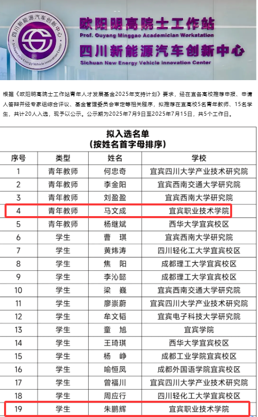 7月8日,从欧阳明高院士工作站青年人才发展基金管理委员会公告获悉,我校新能源电池学院博士马文成、学生朱鹏辉分别荣获2025年欧阳明高院士工作站青年人才发展基金资助。