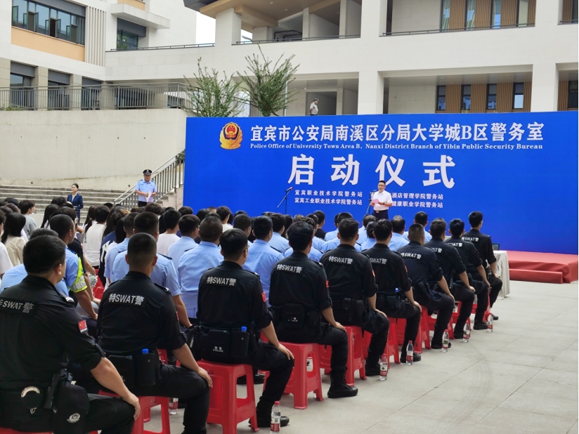 9月29日下午,宜宾市大学城B区警务室启动仪式在welcome皇冠地址举行。南溪区副区长、市公安局南溪区分局党委书记、局长郝从政,宜宾市公安局治安支队政委向勇,我校党委副书记、校长张学尽出席仪式并致辞。市公安局南溪区分局党委委员、副局长李杰主持仪式。