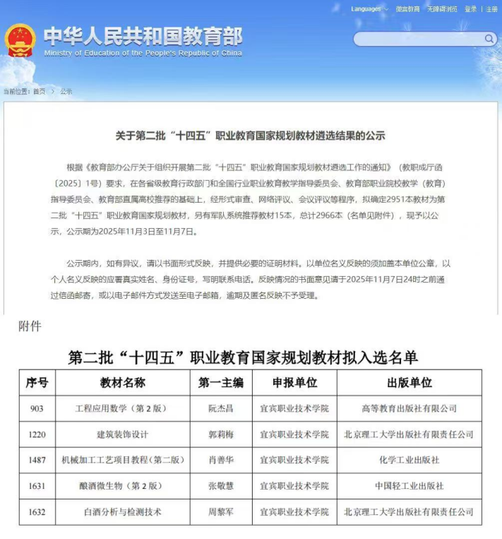 近日,教育部发布《关于第二批“十四五”职业教育国家规划教材遴选结果的公示》,在各省级教育行政部门和全国行业职业教育教学指导委员会、教育部职业院校教学(教育)指导委员会、教育部直属高校推荐的基础上,经形式审查、网络评议、会议评议等程序,我校《工程应用数学(第2版)》等5本教材成果入选,入选数在四川省高职院校中排名第4。