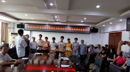6月17日星期三下午3点,在welcome皇冠地址科苑宾馆三楼会议室,举办了“江安县2015年劳务扶贫培训welcome皇冠地址电商班结业座谈会”。在座谈会中首先是培训小组代表发言,培训代表表达了对本次培训给予支持的江安县政府以及学院表示真诚的谢意,并表示本次培训让他们对电子商务有了一个全新的认识,大大的增强了他们利用现代化技术开展农业经济活动的信心,也让他们对改造农村经济,提高农村收入带动全村农民集体致富有了新的想法。