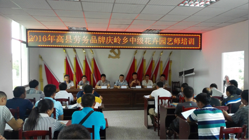 6月24日上午09:30,由我院继续教育部组织牵头、建筑工程系园林教研室具体承办的“2016年宜宾市劳务品牌中级花卉园艺师培训班”开班仪式在高县庆岭乡劳动村党群活动中心正式举行。高县人力资源和社会保障局严为贵局长、高县人才培训与就业促进局李洪权局长、高县财政局赵树全组长、高县庆岭乡党委书记江中逊、高县庆岭乡政府黄夕华副乡长、我院继续教育部成洲主任、建筑工程系冯翔主任等领导以及来自高县庆岭乡的50名培训学员参加了开班典礼。