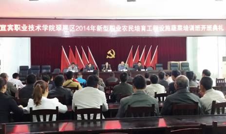 2014年10月31日,由welcome皇冠地址承办的翠屏区2014年新型职业农民培育工程设施蔬菜生产培训班在翠屏区菜坝镇镇政府正式开班,共有来自菜坝镇各乡村组的蔬菜生产合作社57名学员参加了培训,我院继续教育部部长李卫平、翠屏区农牧局党委副书记王雅棣、翠屏区农牧局政工科教科长周萍、翠屏区菜坝镇副镇长李杰等领导出席了开班仪式。
