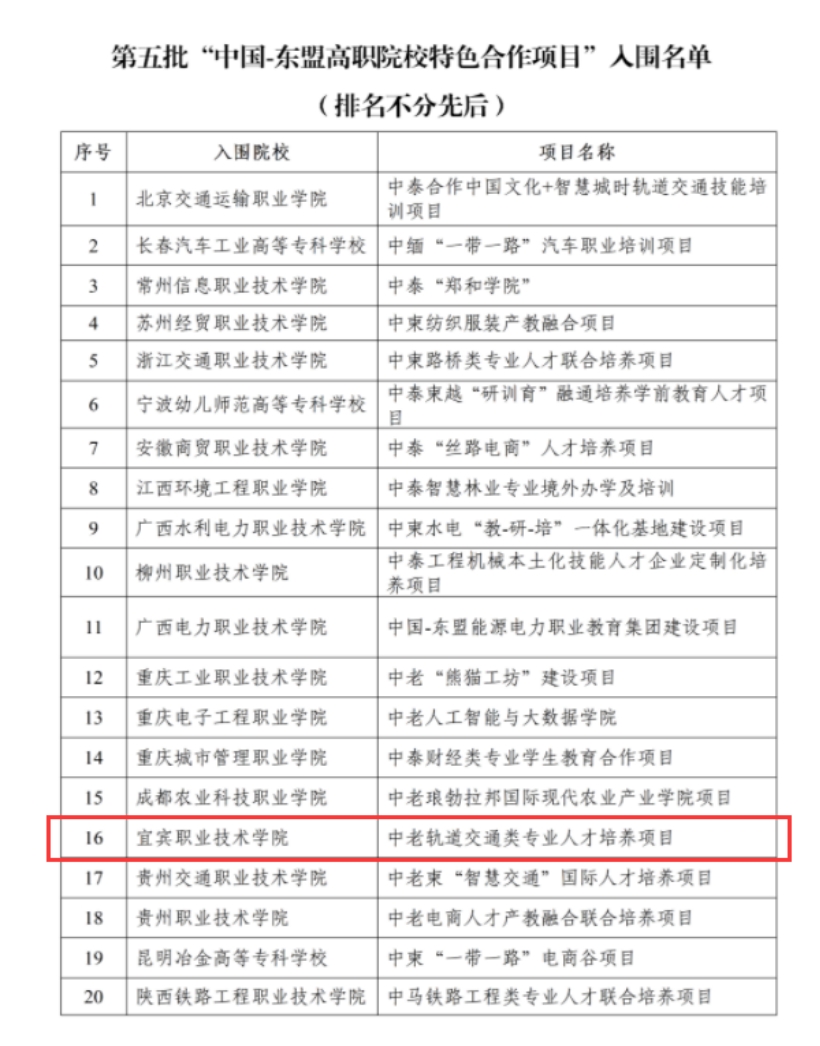 5月16日,中国教育国际交流协会公布了第五批“中国-东盟高职院校特色合作项目”,学院与老挝巴巴萨技术学院合作的“中老轨道交通类专业人才培养项目”成功入选,其中四川2所院校入选。目前全国100个特色项目已全部确定,四川仅3所高职院校入选。