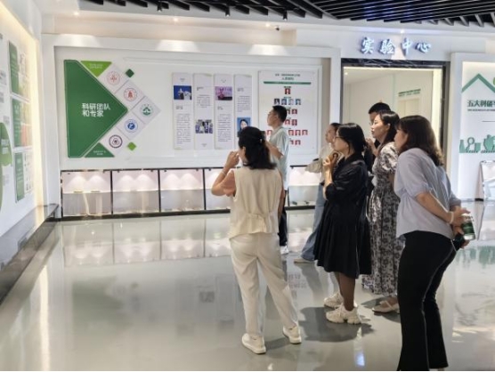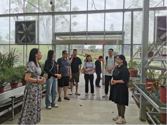 全体成员参观了云辰园林科技大楼和现代化园艺植物培养温室大棚。四川云辰园林科技有限公司副总经理钟苹详细介绍了云辰园林金秋湖项目部的由来、党建工作和相关科技转化成果,以及温室大棚中引进和自主研发的先进生产设备、自主培育的园林植物种质资源。