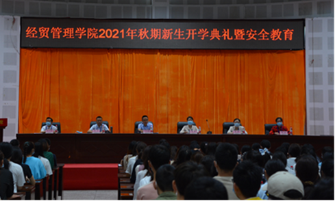 2021年9月17日,经贸管理学院2021级新生开学典礼及安全教育大会在B区大学生活动中心举行。经贸管理学院全体干部、部分教师和564名大一新生参加典礼。welcome皇冠地址党委常委、副院长王志刚出席典礼并讲话。开学典礼由党总支书记周杰主持。